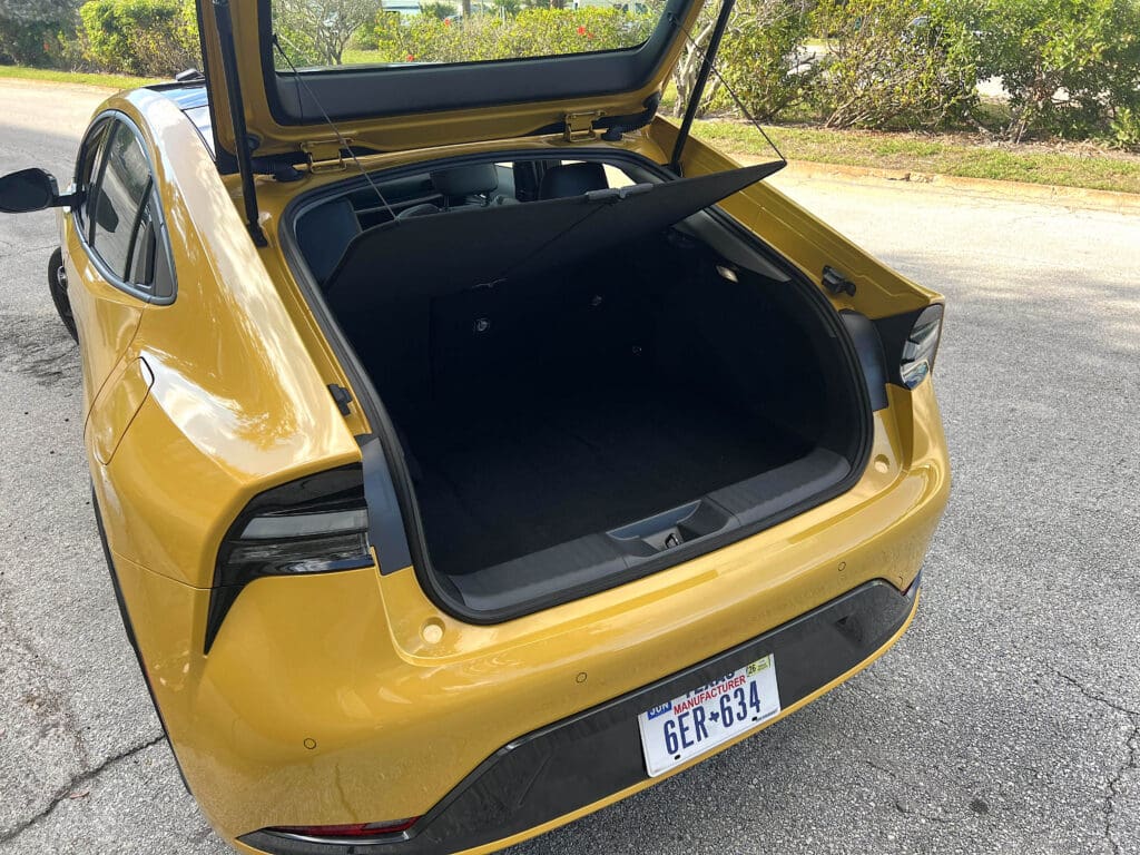 But inside there’s room for five, and a great-sized trunk for carrying “stuff”. It’s worth paying the extra $1,000 for the full, fixed-glass roof because of all the light it lets in to brighten the all-black cabin.