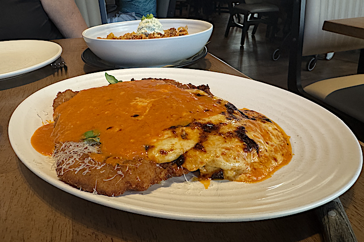 A small, gold-colored crock (also not hot) was stacked high with grated parmesan and crispy prosciutto, the sprouts barely evident. As for the chicken, which came later, a food-runner brought us a plate holding two boneless, breaded breasts, followed by another food-runner who poured on a cheese-infused vodka sauce, which oozed over the bird like lava.