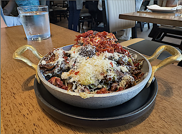 The traffic on Beach Drive was light and the foot traffic moderate, making for a low noise level. We settled in at your basic four-top and ordered the Tavern Brussels appetizer ($10.99), with maple bourbon glaze and bacon; and the Birria Grilled Cheese sandwich ($18.99).