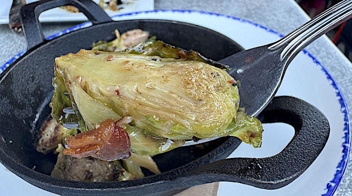 The Brussels sprouts were amply charred, the bacon barely visible. I’m used to cast-iron crocks being hot. This one wasn’t.