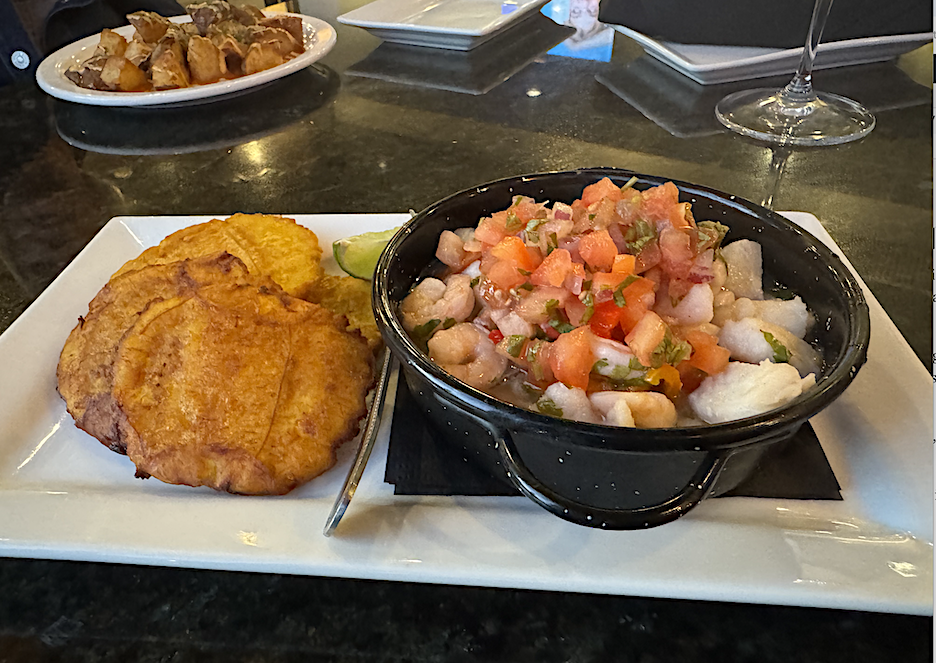 The presentation was not as fancy as that of Pulpo’s, which is more aligned with fine dining. The ceviche included shrimp and scallops along with corvina whitefish, and was topped by a generous pile of diced tomatoes, peppers and onions. Four pieces of fried plantain sat to the side.