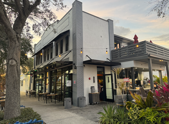 The restaurant occupies a classy building in St. Pete’s Grand Central District. We arrived a few minutes before 6:30 to discover that Don and Linda had beaten us to the restaurant yet again. Although the weather was perfect, we passed up the patio to eat inside. The elegant interior was comfortably dark, with a dining room split by a curved bar. We sat at a banquette.