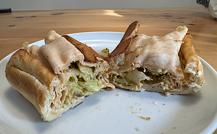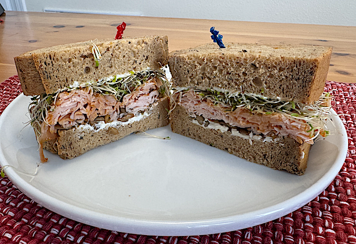 A majestic looking sandwich, with a generous pile of shaved turkey between two planks of Minnesota Wild Rice bread. I could see sprouts, which I hadn’t eaten in a while.