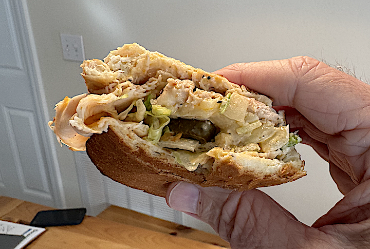 A very handsome 6-inch sandwich — stuffed, but not to the gills. A few thin slices of Buffalo chicken breast lay atop it all. An intriguing, potentially risky, add-on.