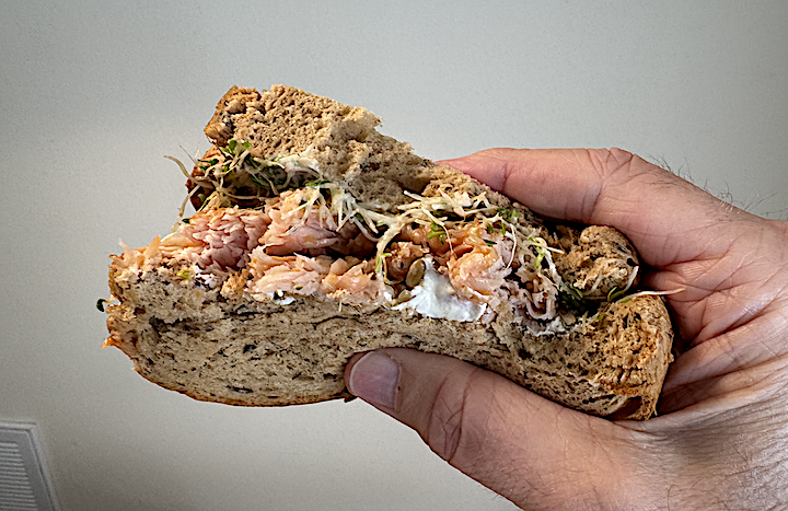 Although this was an open-wide sandwich, once I gained purchase with my mouth, the bread gave way easily — soft and fluffy, essentially crustless. The bird was luscious, with a slightly smoked flavor. Including a shmear of cream cheese was a cool twist.