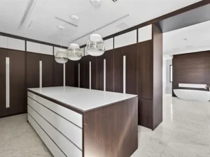 At the heart of the home, a designer kitchen blends form and function with top-of-the-line appliances, high-end finishes, and a custom built-in dining table. Nearby, a glass-enclosed wine cellar creates a dramatic focal point, while the living room’s sleek linear fireplace adds warmth and modern sophistication.