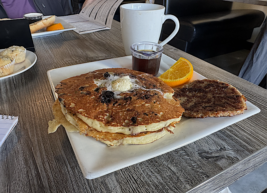 I don’t often eat pancakes, but when I do, I prefer them stuffed with blueberries. And doused with maple syrup. In the first Friday Food Fight to feature pancakes, I wanted to see if I could tell much difference between versions: (1) mass market pancakes at a breakfast-all-day chain that was named after our food in question (IHOP). (2) artisan (my word) pancakes at a small local restaurant with exactly one type on the regular menu: blueberry (City’s Bistro in St. Pete). I get a hankering for pancakes about twice a year. What’s it like to eat them twice in two days? Let’s find out. IHOP Fun facts: International House of Pancakes first opened in California in 1958. When do you think the company officially changed its name to IHOP? (Pause for you to answer). 1973. I thought it was much later. And I bet you did too. Okay, moving on. We arrived at the IHOP in Pinellas Park at 7 p.m. Tuesday, the setting sun offering a glimpse of pink behind the building. Inside, the colorful decor was tempered by warm lighting, which made the nearly empty place kind of homey as we relaxed in our booth. Light pop music on the dining-room sound system tangled with the speed-metal emanating from the kitchen. Neither was loud enough to be much of a distraction, but I’ve heard better mashups. I ordered a Double Blueberry Pancake Combo ($11.79), a short stack with two poached eggs and two strips of bacon. Bonnie ordered a short stack of regular pancakes ($6.59). Appearance Blueberries inside and blueberries piled on top, with a mound of whipped cream over that. Add in maple syrup and my sugar high (and ensuing crash) awaited. Taste and Texture Solid. That’s the best way to describe these pancakes. They were not too fluffy, had some heft. As you’d expect, they tasted strongly of our chosen fruit. The portion — including the eggs and bacon, but especially the pancakes — was just the right size. I finished the entire meal. We drove home to a large full moon sitting low in the sky. I was full, too — but not stuffed. CITY’S BISTRO City’s Bistro is tucked into the south end of a strip center at 4th Street and 35th Avenue North. The place gets stellar reviews for service, and that was certainly on display Wednesday at 10:40 a.m., 20 minutes before pancake cutoff. Our server, Kate, was all smiles and cordiality. She set down a plate containing four little blueberry muffins. A blueberry amuse-bouche. I saved them for later so I wouldn’t be over-blueberried. Value cleanliness in you eateries? While we waited, I saw Kate vigorously spray down and clean off a table and seats at a booth — then sweep up around it. The smallish rectangular space let in plenty of natural light. We sat at a two-top and I ordered Wild Blueberry Buttermilk Pancakes ($12.50) and chose a sausage patty over bacon. Appearance I admired the homemade appearance of this tri-stack. The pancakes were big, but not ridiculously so. The syrup came in a small container. I asked for another. Taste and Texture Here was the test: Could I enjoy pancakes 15 hours after I’d just eaten them? I did. The cake itself had a slightly rustic texture and taste, but the X factor was the blueberries. Sourced from Michigan, they were plump and popped with natural flavor, adding moments of delight. The fruit was concentrated in the middle, so if I wanted to taste more pancake, I ate toward the outer edges. About halfway through, I hit the pancake wall. No sense bringing the leftovers home, although I did box up the mini-muffins for later. At some point years ago, I went on a bad run with sausage patties and switched to links, but this patty (by Boar’s Head) was thin and perfectly cooked. Bonnie ate half. And the Winner of the Battle of the Blueberry Pancakes Is … City’s Bistro. An easy call — but not meant to disparage IHOP. That place served me worthy pancakes, to go along with worthy eggs and bacon. IHOP was up against a small restaurant that scratch-makes its pancakes and goes the extra mile with ingredients. Going in, I wanted to find out if there would be a notable difference. And there was. I liked the vibe at City’s Bistro. The place really has its game together. It’s close to home, so I’ll probably go back. But no pancakes. I’m good on pancakes until, oh, mid-2026.