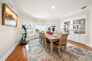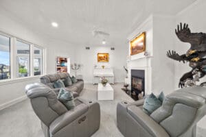 Inside, the home unfolds in soft, neutral tones, filled with natural light and refined architectural details throughout. The open layout blends elegance with warmth, beginning with a formal living room anchored by an electric fireplace ideal for quiet nights in or hosting guests. The dining room features custom-built-ins and panoramic water views, making every gathering feel special.