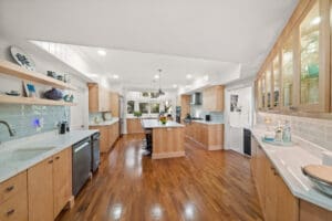 The kitchen is truly the heart of the home. Designed for both everyday living and entertaining, it features a large quartz island, premium stainless steel appliances, a natural gas cooktop, a Viking refrigerator, and two dishwashers plus a private desk space overlooking tropical foliage. Just beyond, the spacious family room includes built-ins, a gas fireplace, and expansive water views that invite effortless indoor-outdoor living.