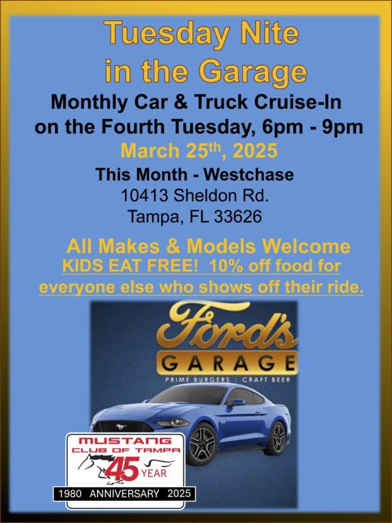 Every month on the fourth Tuesday. Hosted by the Mustang Club of Tampa. Open to all makes and models, kids eat free, and 10% off your food bill if you show off your ride. Great food, craft beer and awesome people. Start: June 24, 2025 6:00 pm End: June 24, 2025 9:00 pm Venue: Ford’s Garage – Westchase Address: 10413 Sheldon Rd., Tampa, FL 33626 Categories: Recurring, Tuesday, West Coast of Florida Registration Fee: Free Phone: (727) 743-2146 Bob