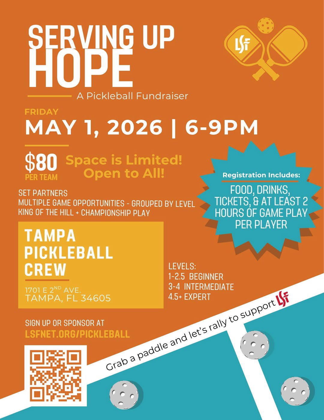 Grab a paddle and let’s rally for a good cause! Join us on the court for an exhilarating evening of pickleball action in our annual tournament. Space is limited to 30 teams (60 players) over 10 courts. There will be King of the Hill play segmented into skill level, so there’s a place for everyone to smash, lob, and dink their way to victory—all while making a positive impact. So grab your paddle, gather your team, and let’s serve up hope together!