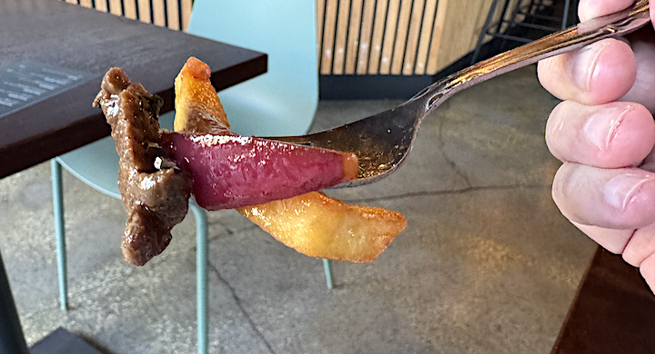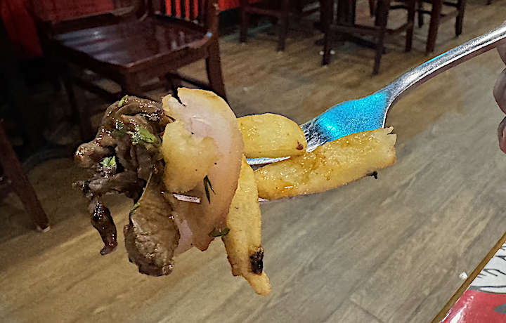 I ate forkfuls of beef and fries, mixed with the sauce. The Asian-style rice (not sticky) proved a welcome sidekick. The hefty pieces of onion were crunchy, the tomatoes juicy.
