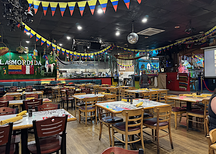 La Mordida (“the Bite”) sits in a strip center wedged into the junction of U.S. 19 and 66th Street. We arrived at 6:30 on Tuesday under brilliantly sunny skies. Inside, the large space was bright, crammed with tables and festooned with colorful streamers and other Latin-American signifiers.