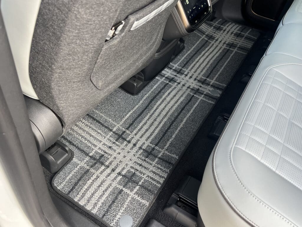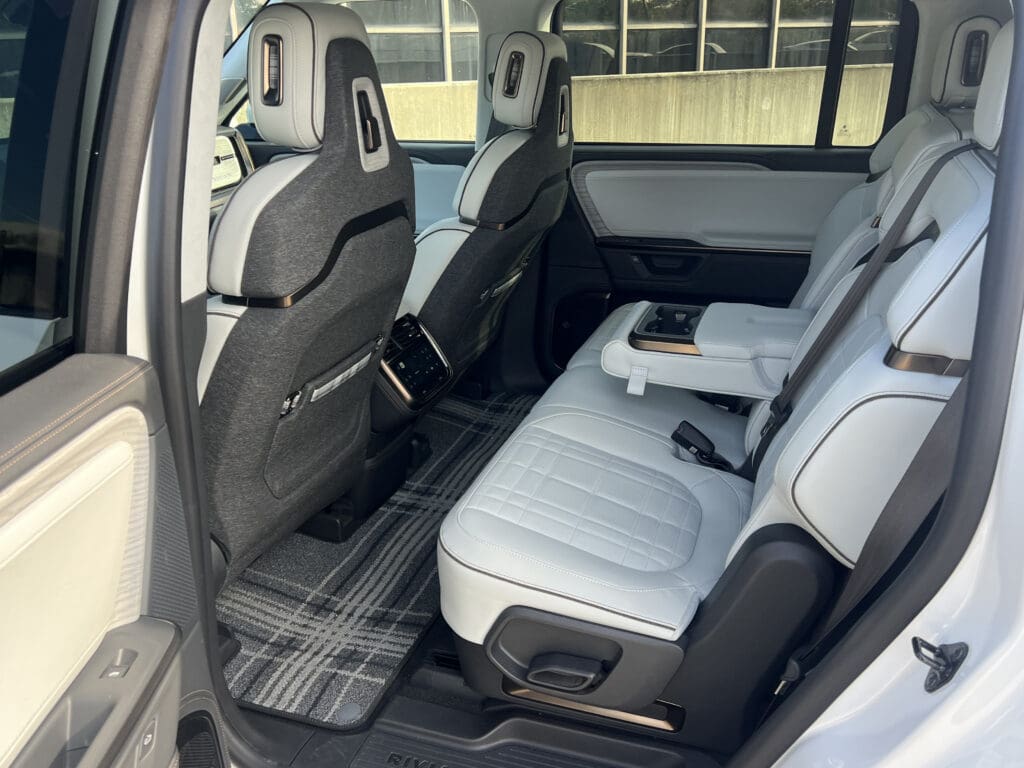 As a load-carrier, the Rivian is a star. At the rear, there’s a Range Rover-style split tailgate that’s perfect for tailgating. Keep the third row in place and you have 18 cubic feet of space.