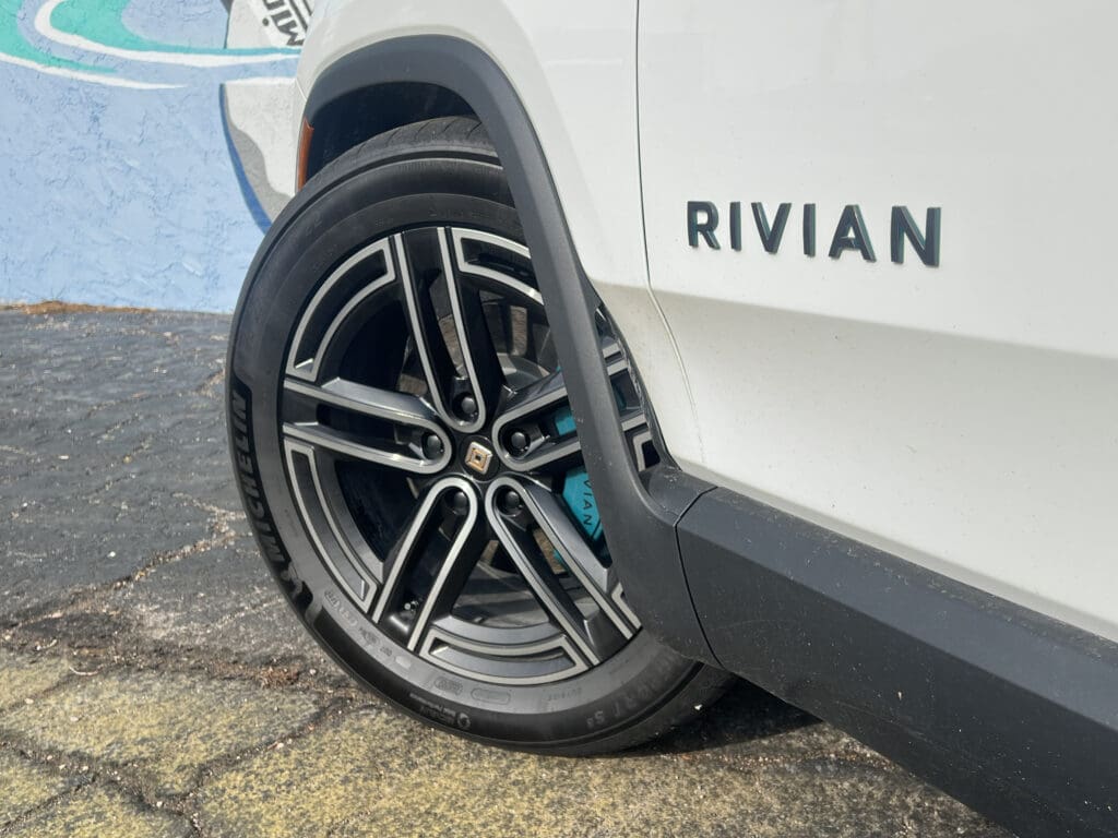 While the R1S’s shape was first revealed in 2018, it has definitely stood the test of time. This is still a great-looking SUV, with that boxy, minimalist design, distinctive horizontal front LED light bar and suppository-shaped headlights. Cool-looking 22-inch alloys and turquoise brake covers add to the visual drama.