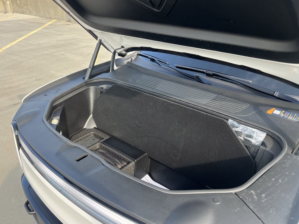 Drop the second row bench and it soars to 91 cubic feet. And the party piece is the forward “frunk” that adds another 10 cu. ft.