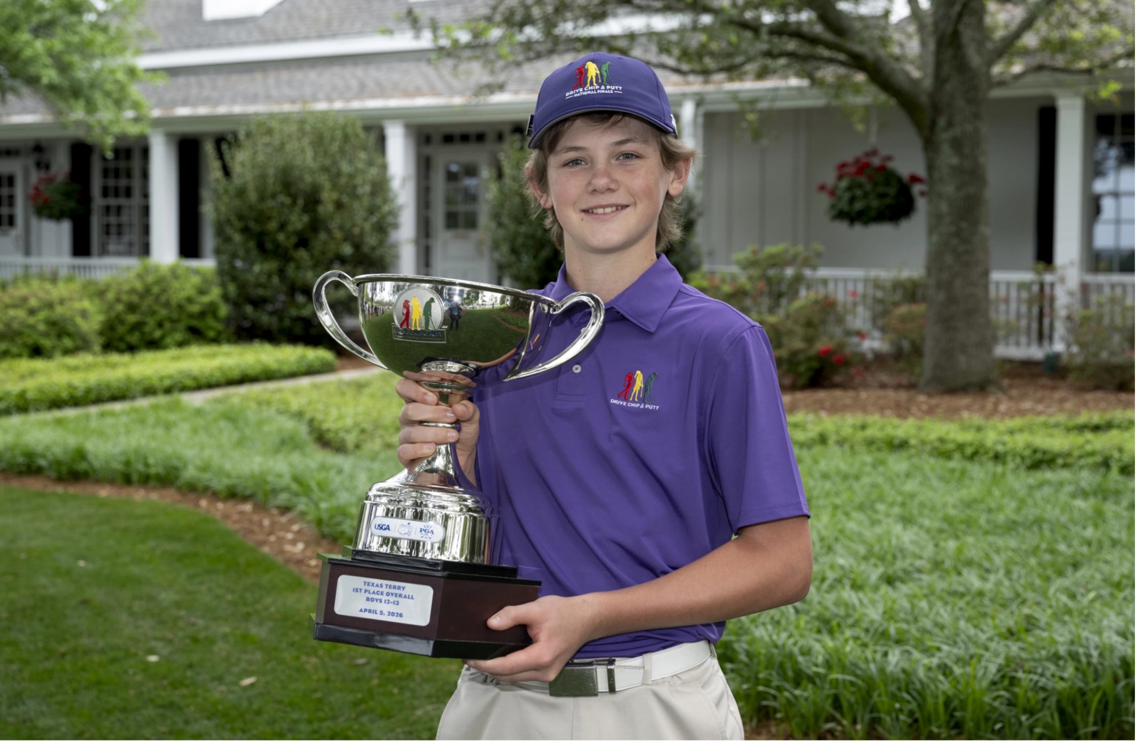 First place overall winner, Texas Terry, of the Boys 12-13 group with his trophy at the Drive, Chip and Putt National Finals at Augusta National Golf Club, Sunday, April 05, 2026.