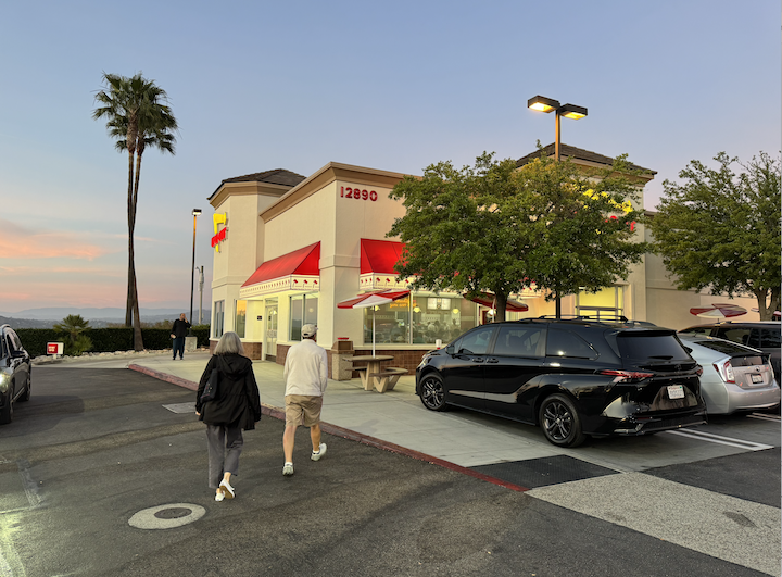 We arrived at a San Diego location near the home of our hosts — Bob (the Driver) and Vicki (the Navigator) Dillon — at 7 p.m. Sunday, with a pink-hued sunset as a backdrop. A line of cars that would do Chick-fil-A-proud snaked out of the drive-thru. No matter — we were eat-in people.