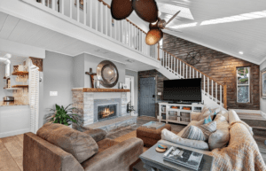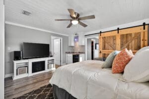 Designed for both luxury and livability, the home welcomes you with vaulted tongue-and-groove ceilings and sunlit interiors that create a breezy, open atmosphere. Warm wood-look tile flooring connects each space, while a cozy wood-burning fireplace adds character and comfort to one of the two inviting living areas. The chef-inspired kitchen balances beauty and function, featuring custom cabinetry, stone countertops, and abundant storage. This home is ideal for hosting everything from casual brunches to sunset dinners.