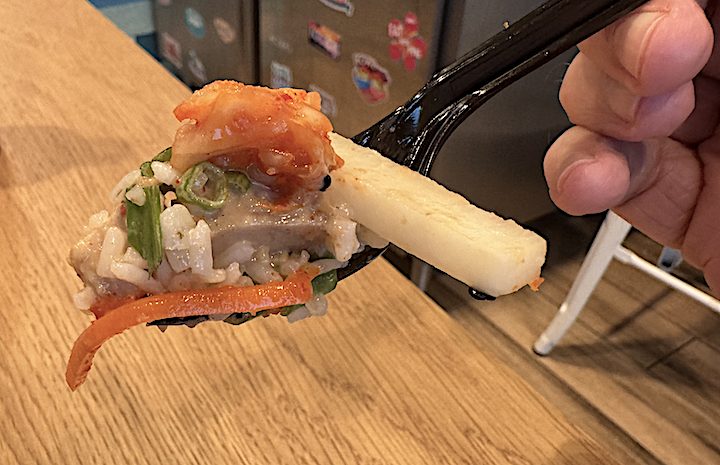 I got the kimchi on the side because the girls cautioned me that it was spicy hot. Well, maybe a little. The kimchi’s zing banded together with pickled veggies to form a delightful complement to the cubed chicken, which wasn’t actually barbecued. Only the rice was warm. The X-factor was the white daikon radish, which came in long wedges that added delightful crunch. Overall, though, I couldn’t detect much Korean BBQ character.