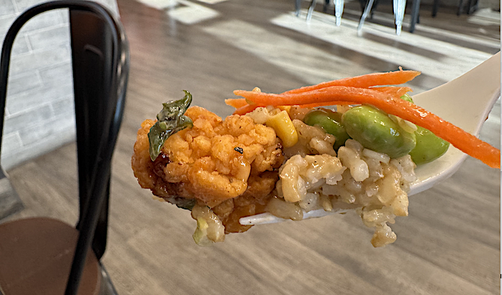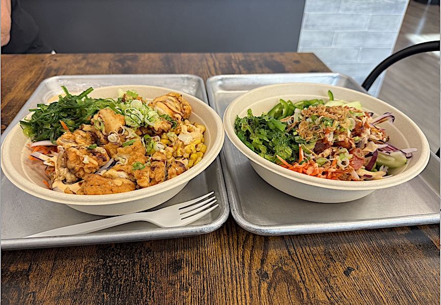 Poke Island has a few specialty bowls, but our genial server, Van — who’s part of the family from Southeast Asia that owns the restaurant — suggested we use the build-your-own model. More options, better value. We chose the Spicy Tuna ($14.49) with white rice, and Fried Chicken ($12.49) with brown rice, and added Seaweed Salad to each for $1.50 per.