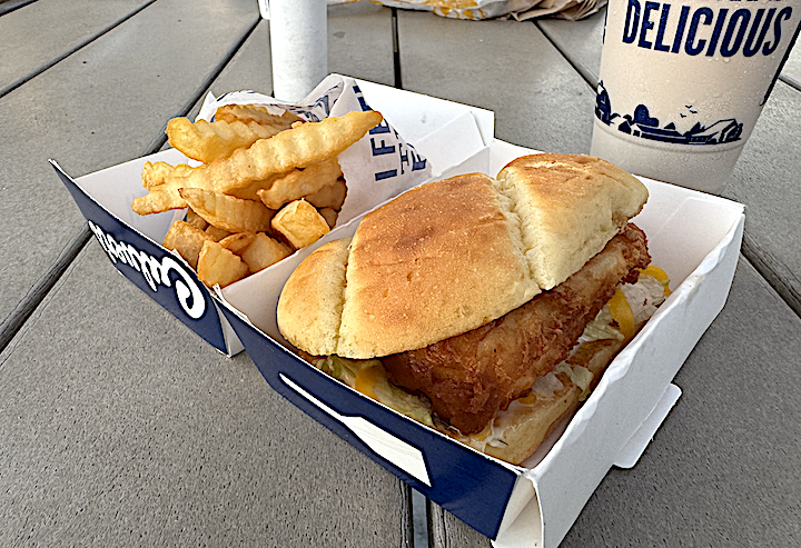 This presented more as a meal than what we had at Culver’s. Two slabs of fried tilapia protruded from the bun, and the plastic plate was filled out by basic fries.