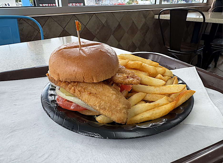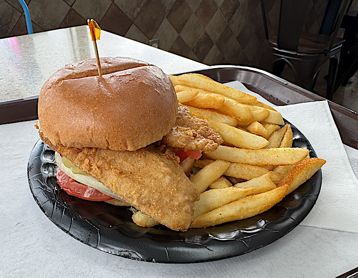 We decided to eat in — because there’s no place to eat outside. The restaurant’s interior is beige-y and nondescript, but comfortable enough. I ordered the fish sandwich platter, with fries and a drink ($12.59). The manager, Craig, explained that I could get the sandwich with mayo, tomatoes, onion and pickles. “The works,” I said. He waived the $1 fee for a small container of  tartar sauce.