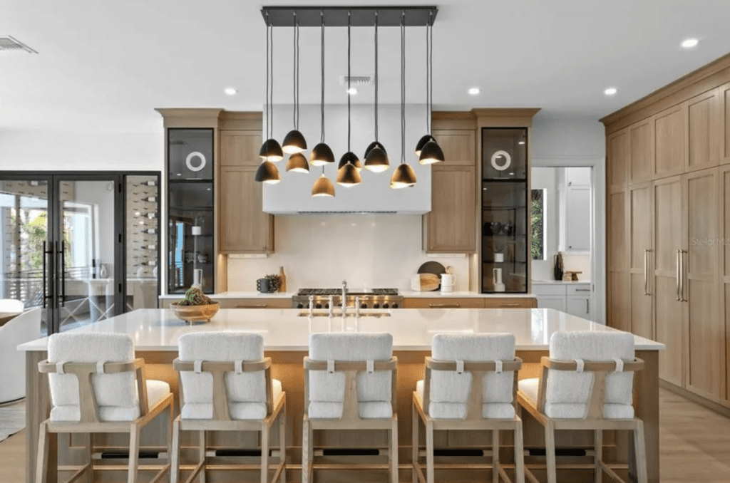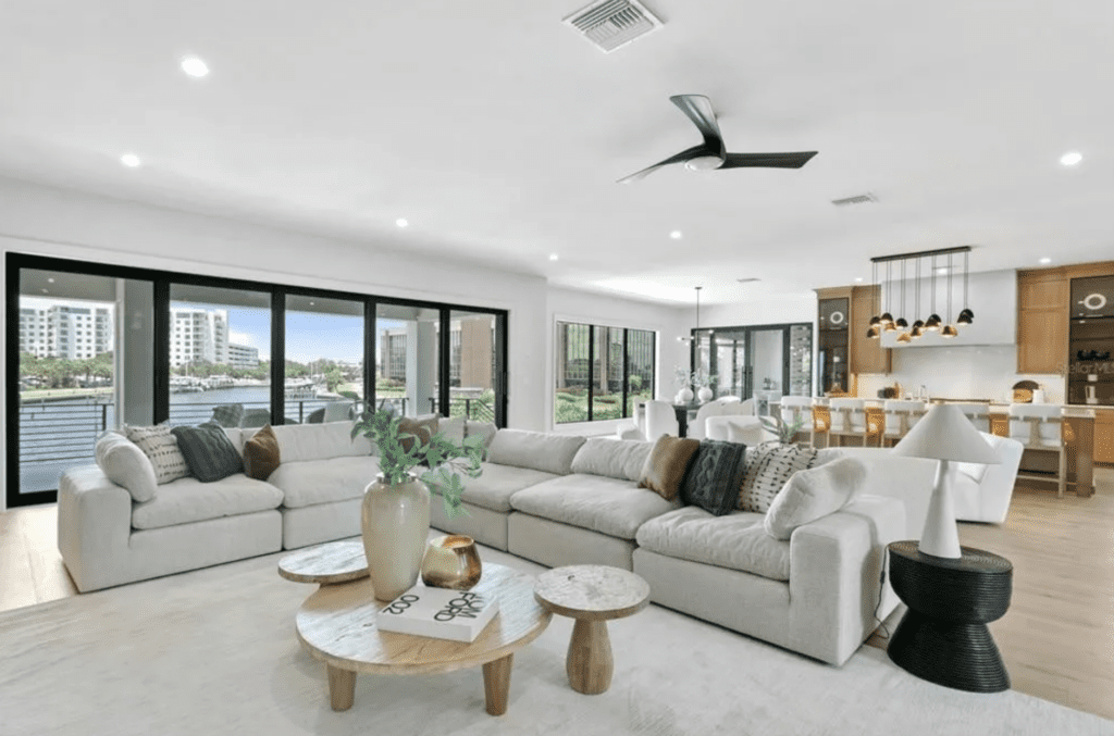 The great room, second seating area, and chef’s kitchen are seamlessly connected in the open floor plan, which is lit by natural light from the bay.