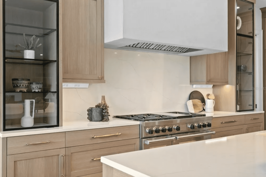 Notable features include a dramatic staircase and stunning foyer entry, a custom entertaining wall with a fireplace, and an impressive wine lounge showcasing an artistic display of over 150 bottles. The first level features a chef’s kitchen equipped with top-of-the-line Sub-Zero and Wolf appliances, a gas range, quartz countertops and backsplash, a spacious center island, a large main pantry, and a butler’s pantry. The inviting great room and dining area provide access to a waterfront terrace, perfect for entertaining.